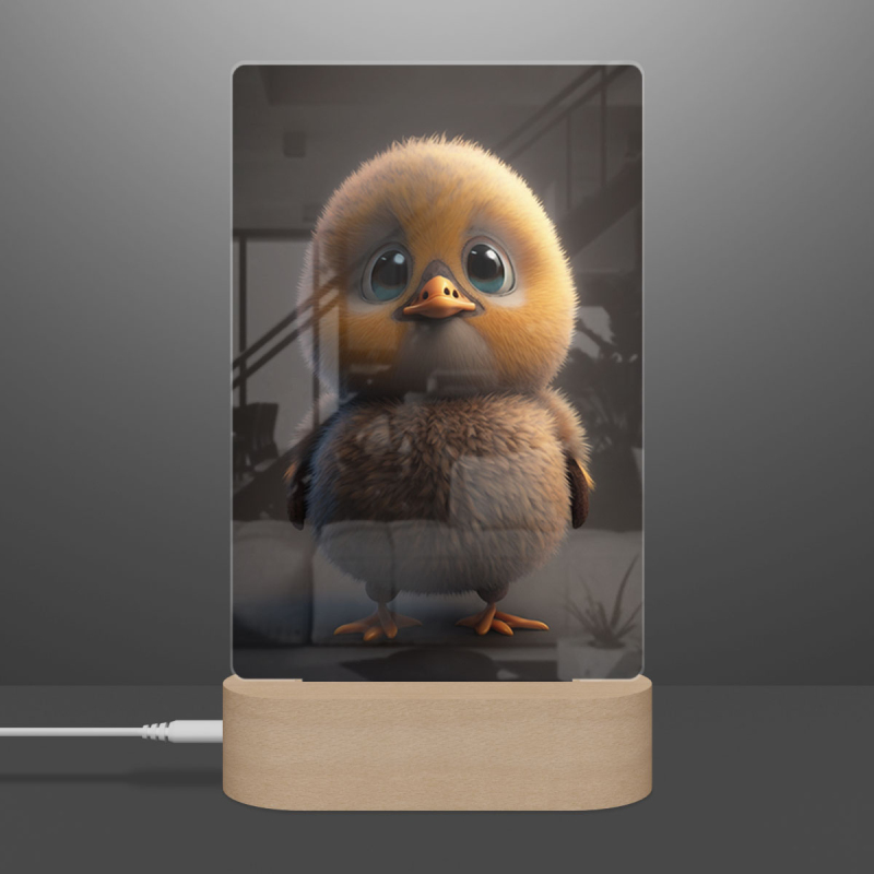 Součástí balení je akrylové sklo dle výběru, dřevěný RGB LED stojánek a napájecí USB kabel.