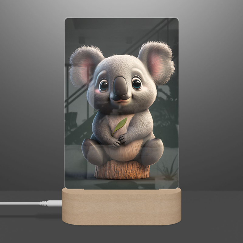 Součástí balení je akrylové sklo dle výběru, dřevěný RGB LED stojánek a napájecí USB kabel.