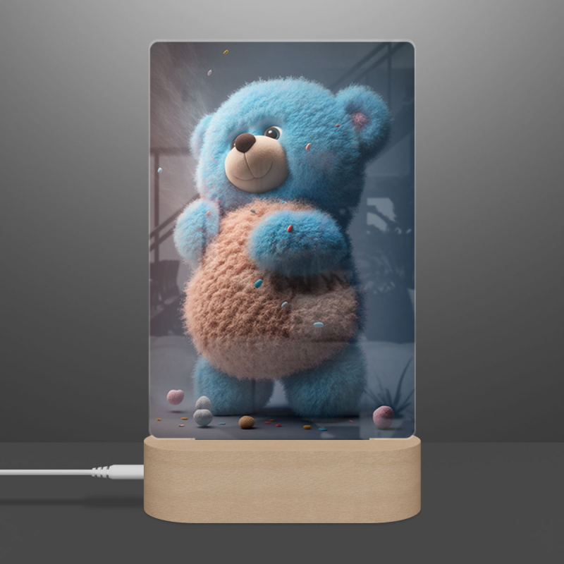 Součástí balení je akrylové sklo dle výběru, dřevěný RGB LED stojánek a napájecí USB kabel.