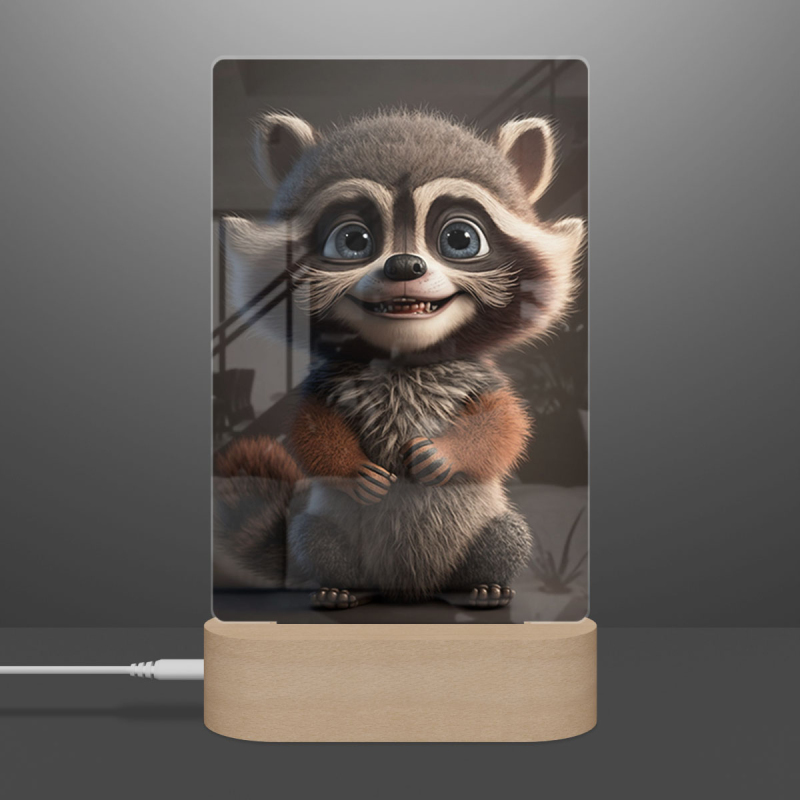 Součástí balení je akrylové sklo dle výběru, dřevěný RGB LED stojánek a napájecí USB kabel.