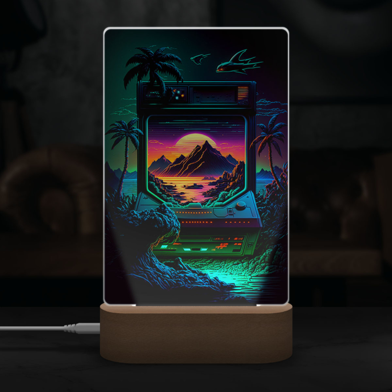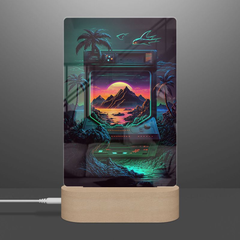 Součástí balení je akrylové sklo dle výběru, dřevěný RGB LED stojánek a napájecí USB kabel.