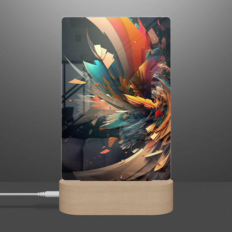 Součástí balení je akrylové sklo dle výběru, dřevěný RGB LED stojánek a napájecí USB kabel.