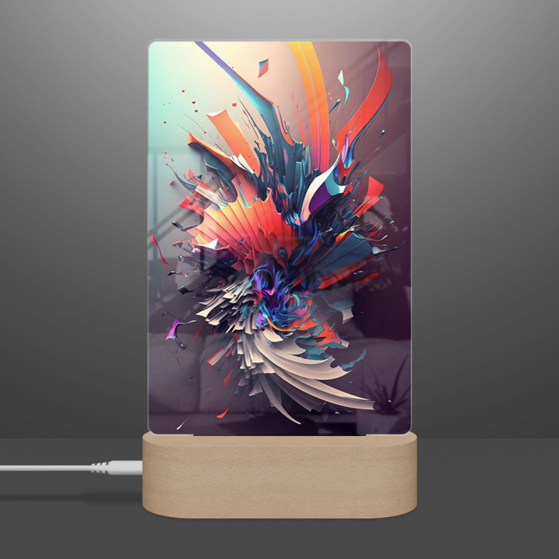 Součástí balení je akrylové sklo dle výběru, dřevěný RGB LED stojánek a napájecí USB kabel.