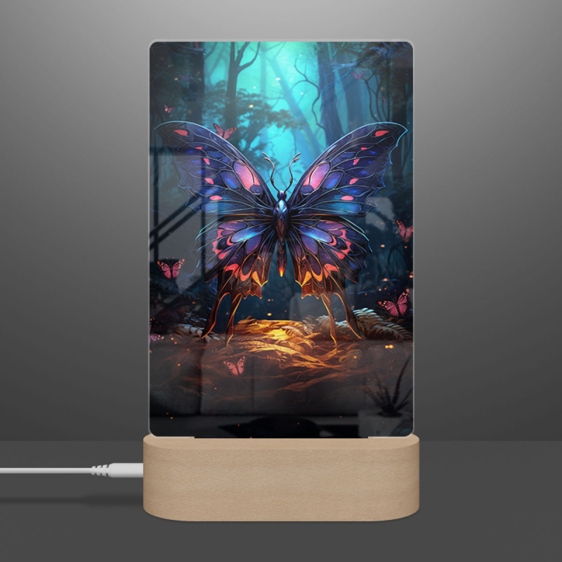 Součástí balení je akrylové sklo dle výběru, dřevěný RGB LED stojánek a napájecí USB kabel.
