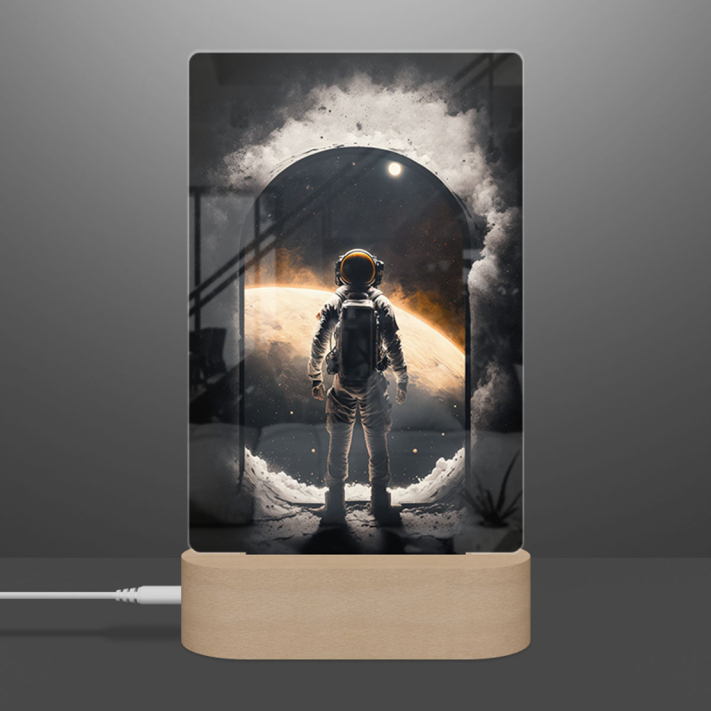 Součástí balení je akrylové sklo dle výběru, dřevěný RGB LED stojánek a napájecí USB kabel.
