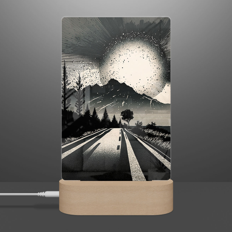 Součástí balení je akrylové sklo dle výběru, dřevěný RGB LED stojánek a napájecí USB kabel.
