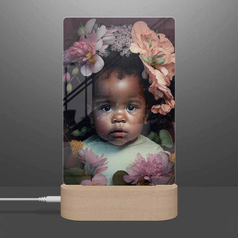 Součástí balení je akrylové sklo dle výběru, dřevěný RGB LED stojánek a napájecí USB kabel.