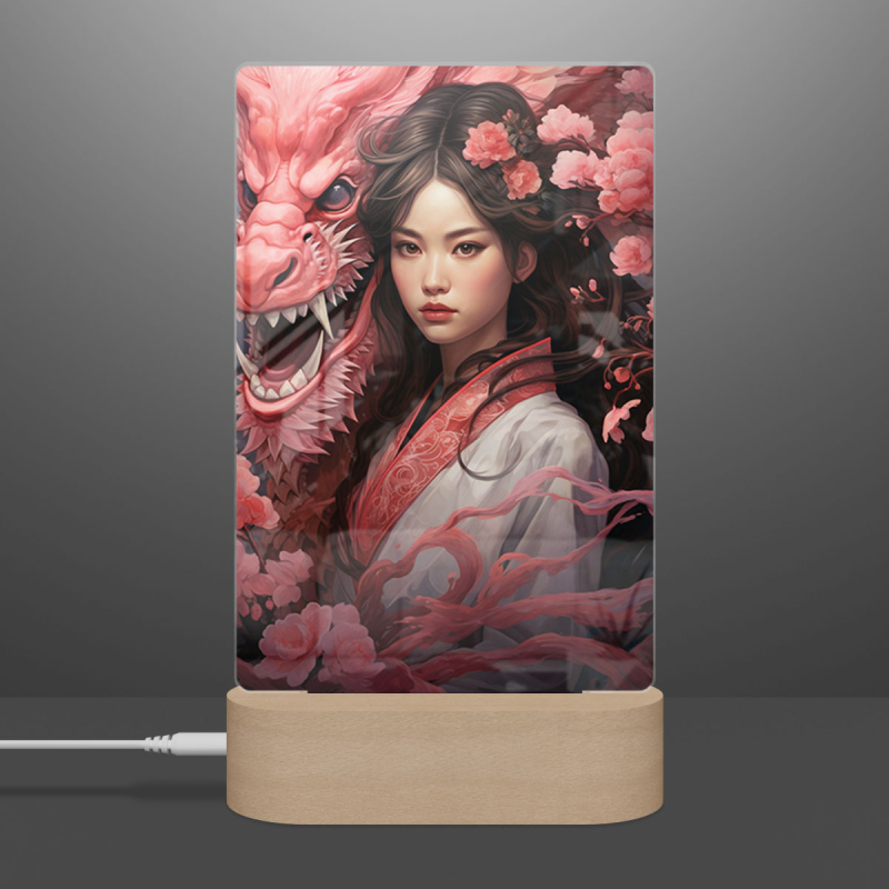 Součástí balení je akrylové sklo dle výběru, dřevěný RGB LED stojánek a napájecí USB kabel.