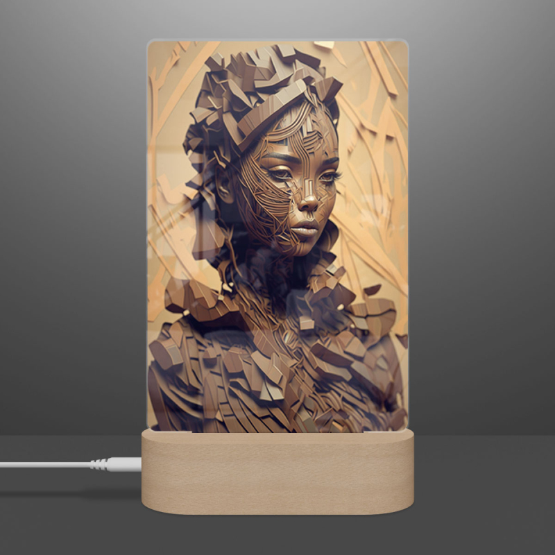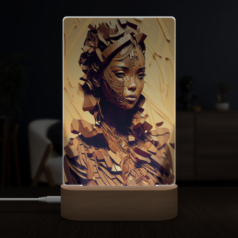 Součástí balení je akrylové sklo dle výběru, dřevěný RGB LED stojánek a napájecí USB kabel.