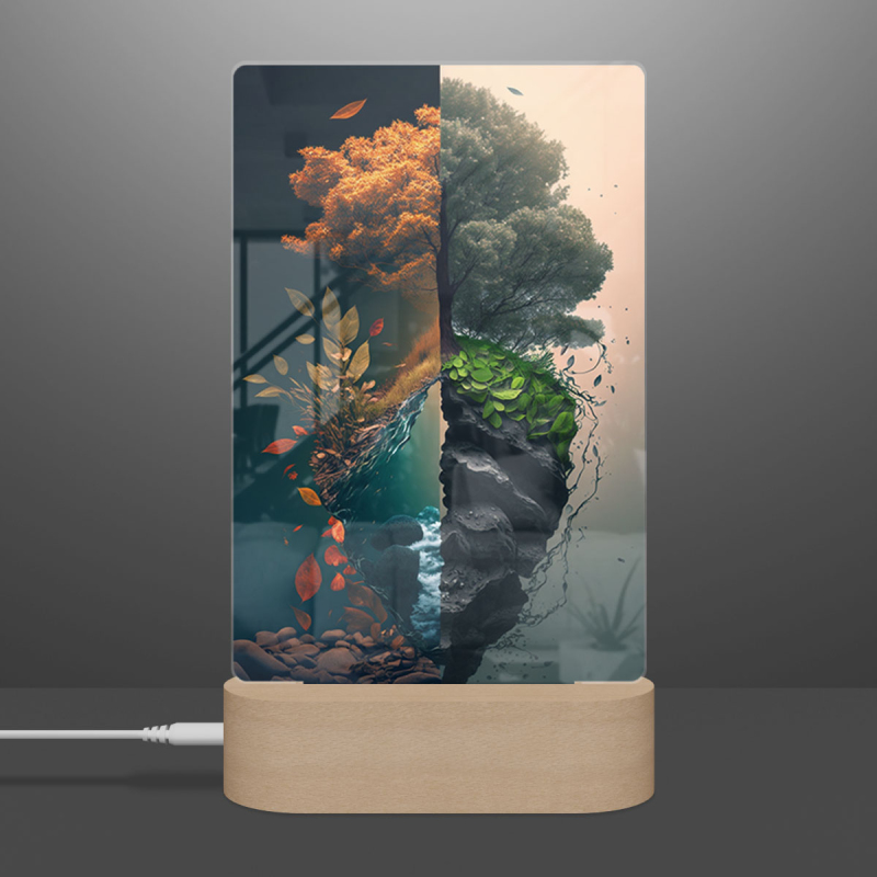 Součástí balení je akrylové sklo dle výběru, dřevěný RGB LED stojánek a napájecí USB kabel.