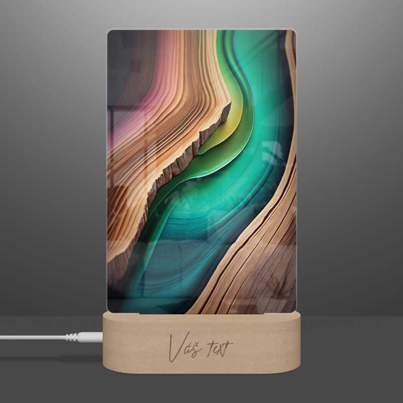 Součástí balení je akrylové sklo dle výběru, dřevěný RGB LED stojánek a napájecí USB kabel.