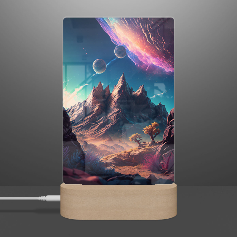 Součástí balení je akrylové sklo dle výběru, dřevěný RGB LED stojánek a napájecí USB kabel.