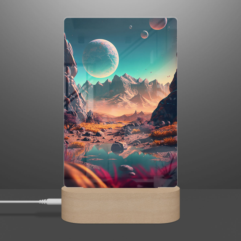 Součástí balení je akrylové sklo dle výběru, dřevěný RGB LED stojánek a napájecí USB kabel.