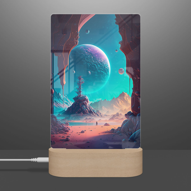 Součástí balení je akrylové sklo dle výběru, dřevěný RGB LED stojánek a napájecí USB kabel.
