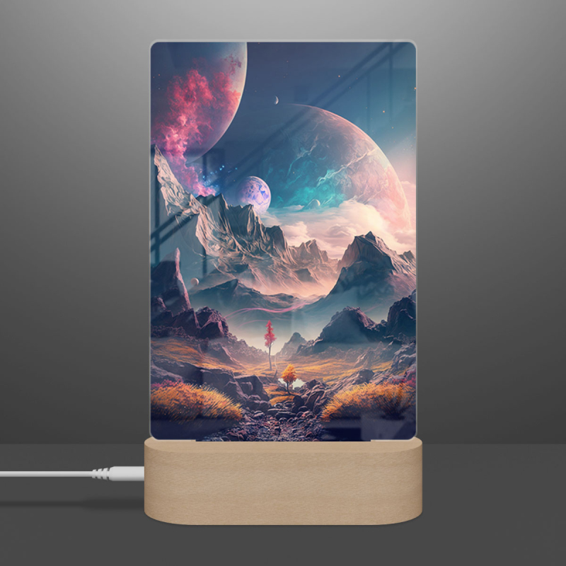 Součástí balení je akrylové sklo dle výběru, dřevěný RGB LED stojánek a napájecí USB kabel.