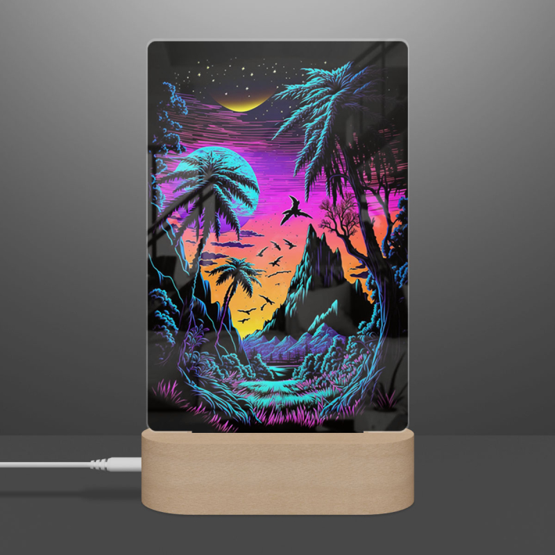 Součástí balení je akrylové sklo dle výběru, dřevěný RGB LED stojánek a napájecí USB kabel.