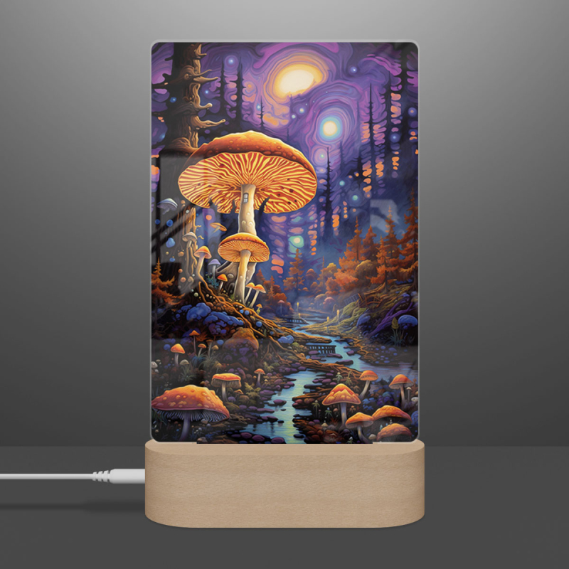 Součástí balení je akrylové sklo dle výběru, dřevěný RGB LED stojánek a napájecí USB kabel.