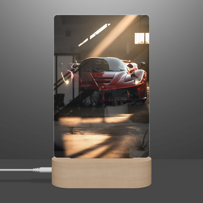 Součástí balení je akrylové sklo dle výběru, dřevěný RGB LED stojánek a napájecí USB kabel.
