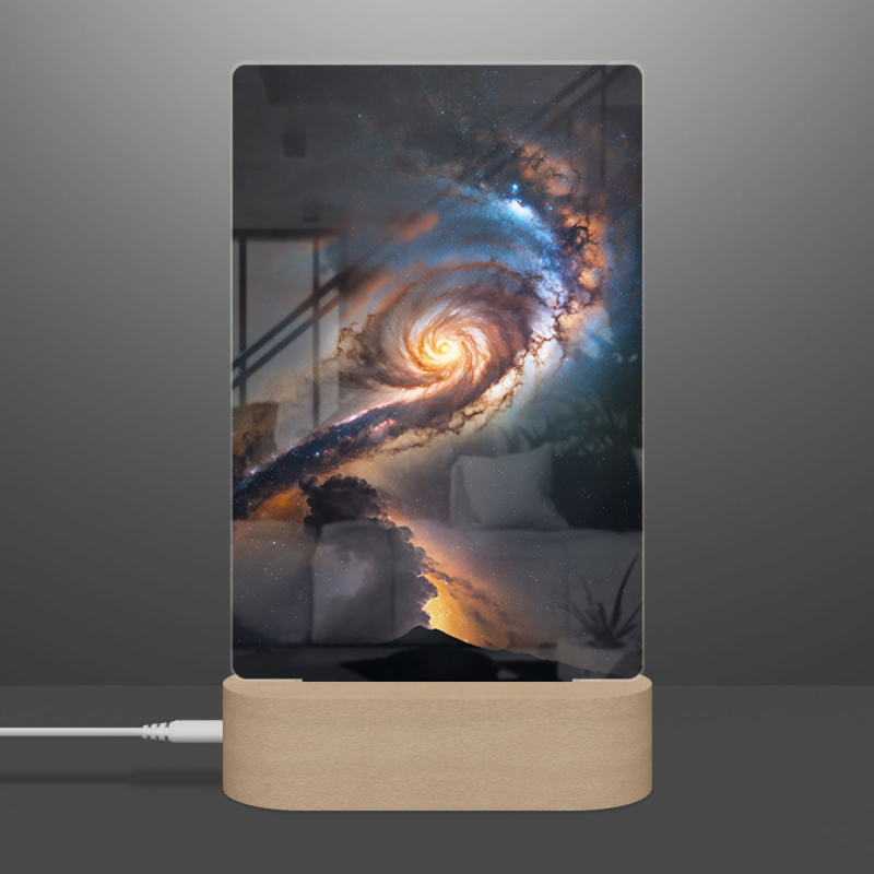 Součástí balení je akrylové sklo dle výběru, dřevěný RGB LED stojánek a napájecí USB kabel.