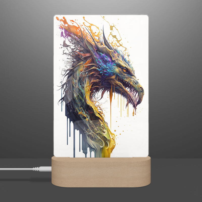 Součástí balení je akrylové sklo dle výběru, dřevěný RGB LED stojánek a napájecí USB kabel.
