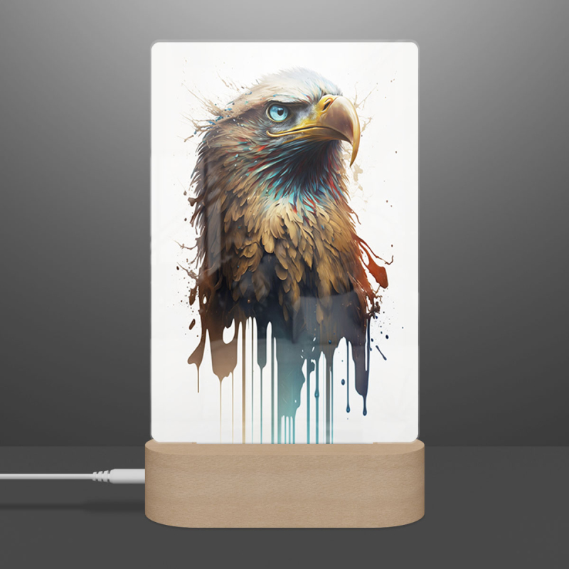 Součástí balení je akrylové sklo dle výběru, dřevěný RGB LED stojánek a napájecí USB kabel.