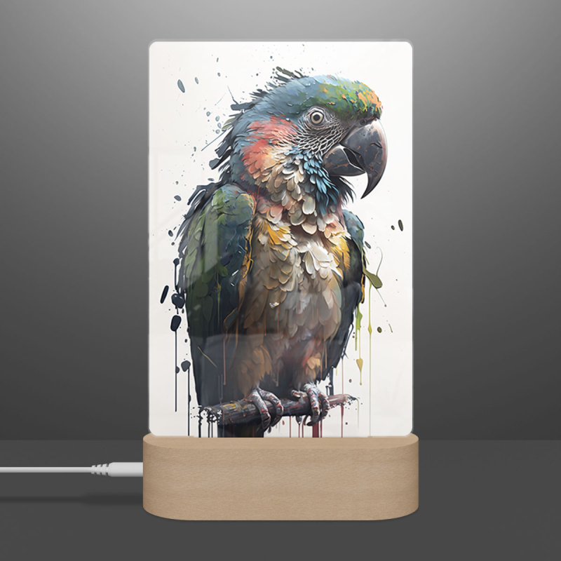 Součástí balení je akrylové sklo dle výběru, dřevěný RGB LED stojánek a napájecí USB kabel.