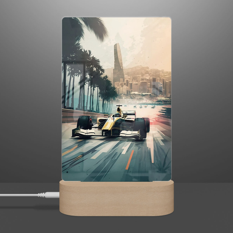 Součástí balení je akrylové sklo dle výběru, dřevěný RGB LED stojánek a napájecí USB kabel.