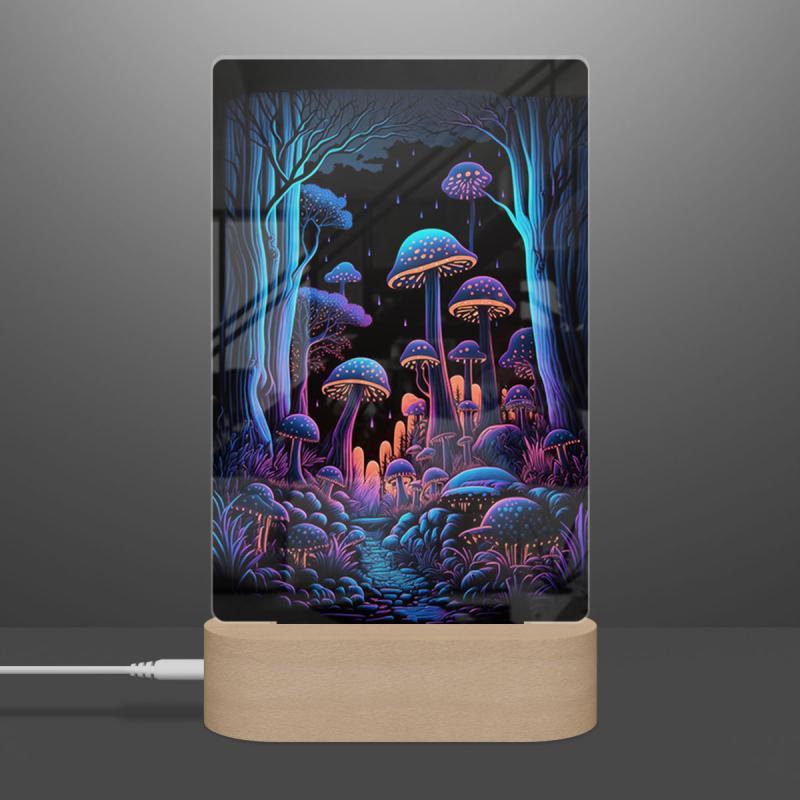 Součástí balení je akrylové sklo dle výběru, dřevěný RGB LED stojánek a napájecí USB kabel.