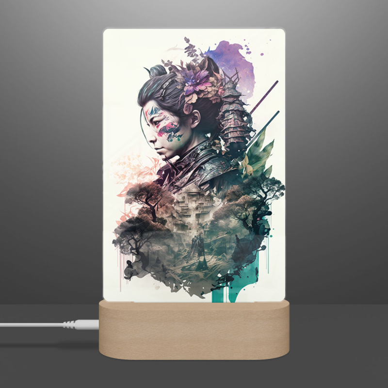 Součástí balení je akrylové sklo dle výběru, dřevěný RGB LED stojánek a napájecí USB kabel.