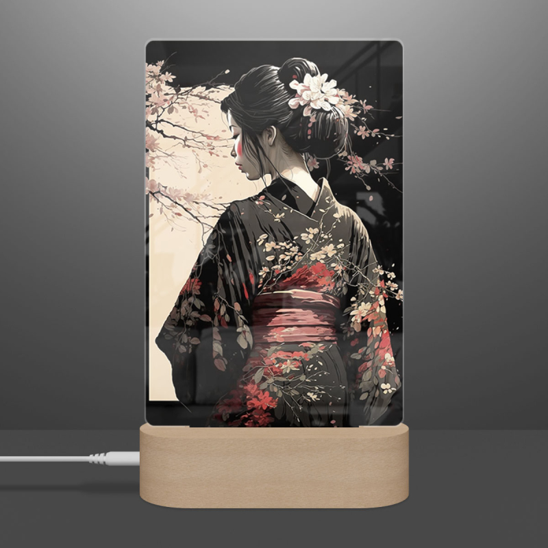 Součástí balení je akrylové sklo dle výběru, dřevěný RGB LED stojánek a napájecí USB kabel.