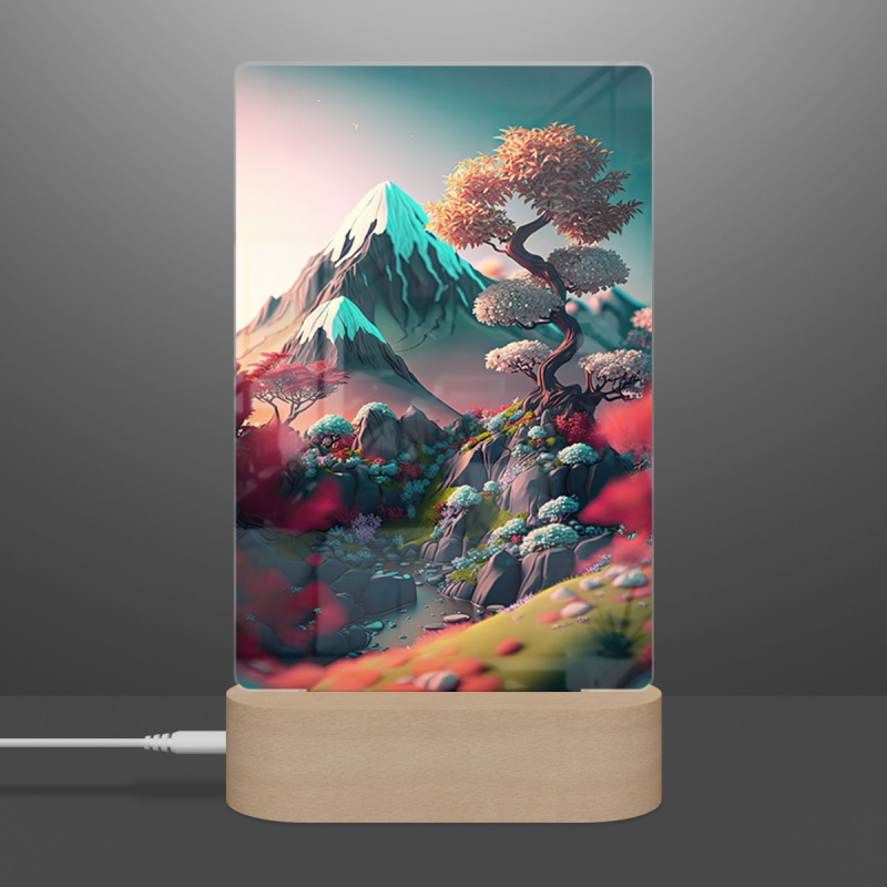 Součástí balení je akrylové sklo dle výběru, dřevěný RGB LED stojánek a napájecí USB kabel.