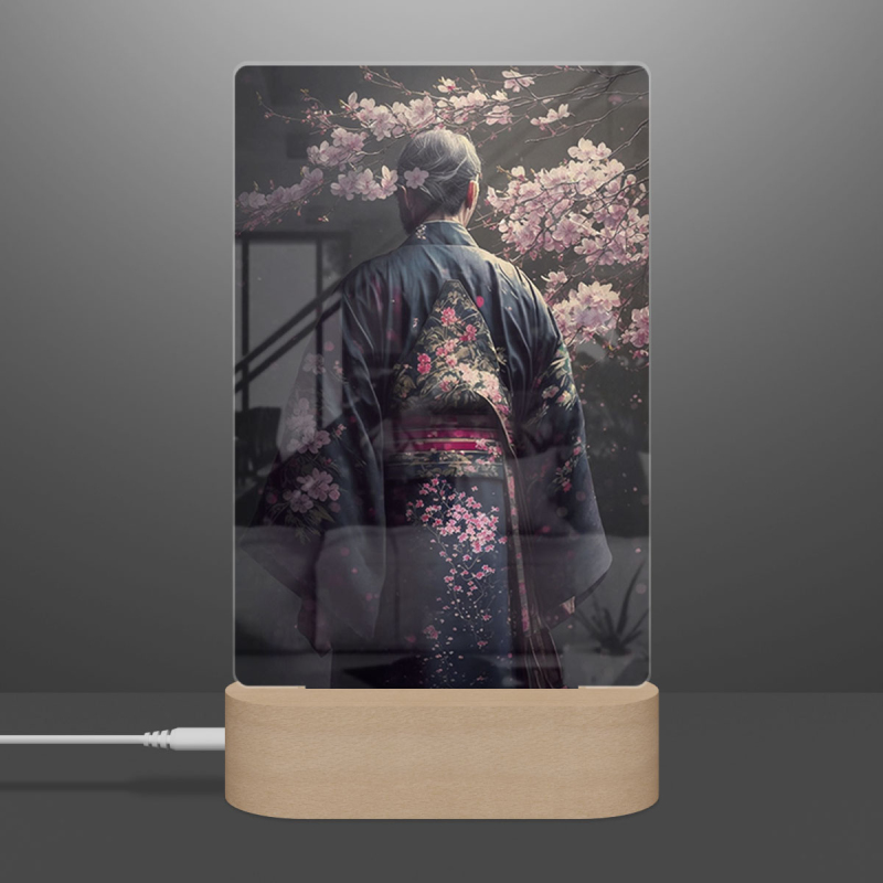 Součástí balení je akrylové sklo dle výběru, dřevěný RGB LED stojánek a napájecí USB kabel.