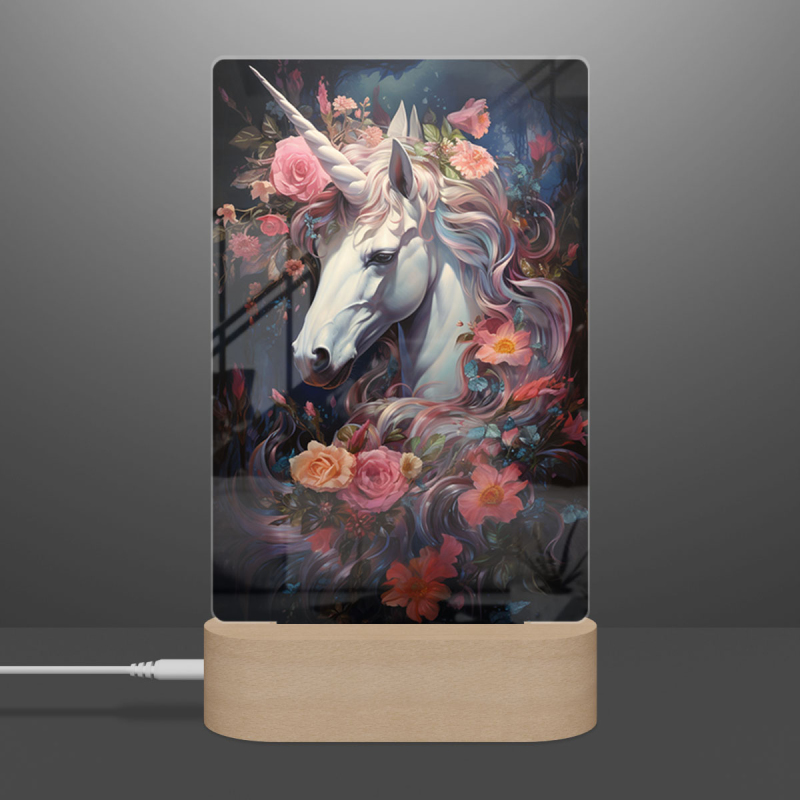 Součástí balení je akrylové sklo dle výběru, dřevěný RGB LED stojánek a napájecí USB kabel.