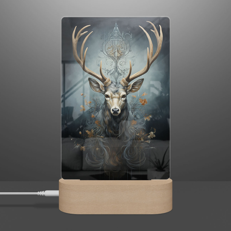 Součástí balení je akrylové sklo dle výběru, dřevěný RGB LED stojánek a napájecí USB kabel.