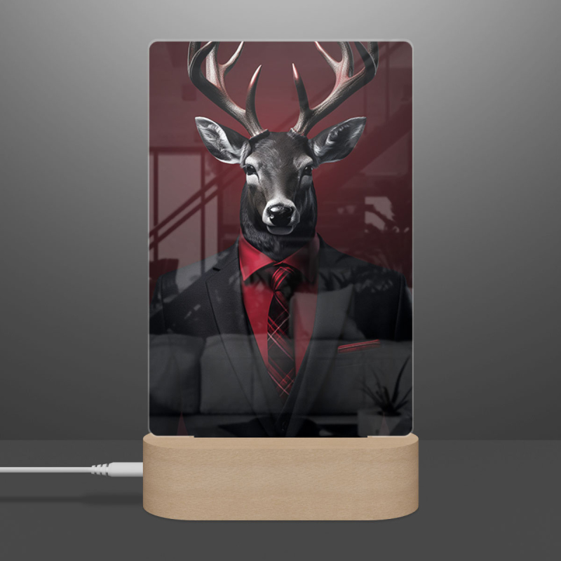 Součástí balení je akrylové sklo dle výběru, dřevěný RGB LED stojánek a napájecí USB kabel.