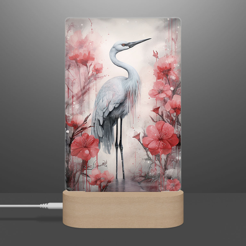 Součástí balení je akrylové sklo dle výběru, dřevěný RGB LED stojánek a napájecí USB kabel.