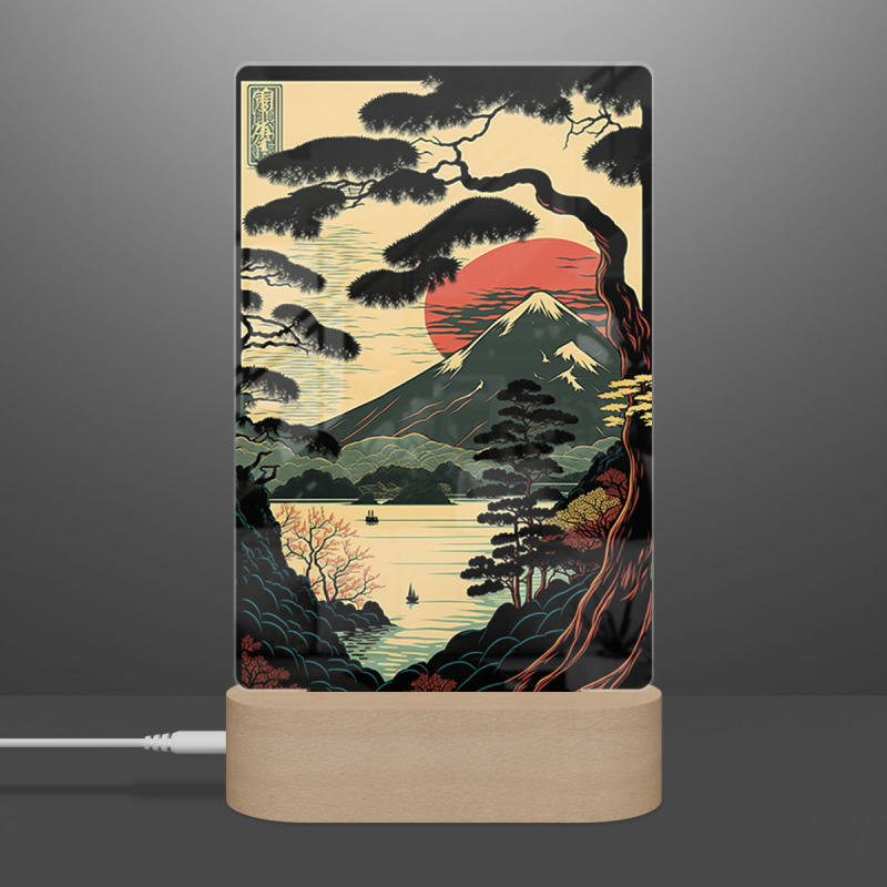 Součástí balení je akrylové sklo dle výběru, dřevěný RGB LED stojánek a napájecí USB kabel.