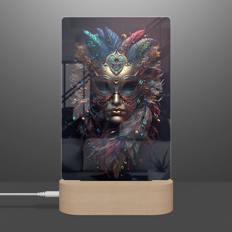 Součástí balení je akrylové sklo dle výběru, dřevěný RGB LED stojánek a napájecí USB kabel.