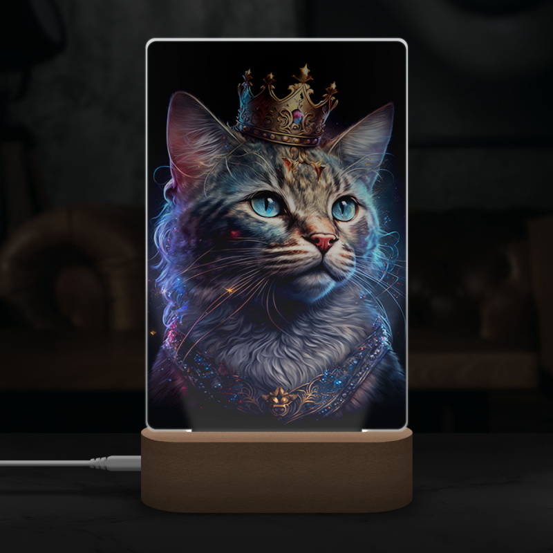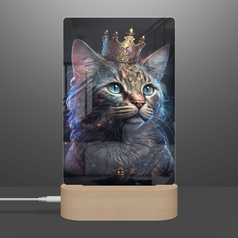 Součástí balení je akrylové sklo dle výběru, dřevěný RGB LED stojánek a napájecí USB kabel.