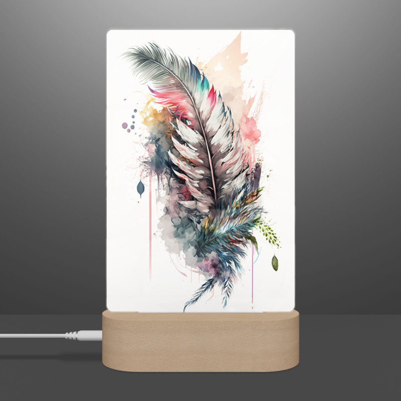 Součástí balení je akrylové sklo dle výběru, dřevěný RGB LED stojánek a napájecí USB kabel.