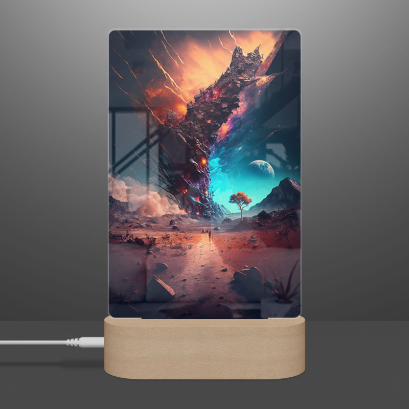 Součástí balení je akrylové sklo dle výběru, dřevěný RGB LED stojánek a napájecí USB kabel.