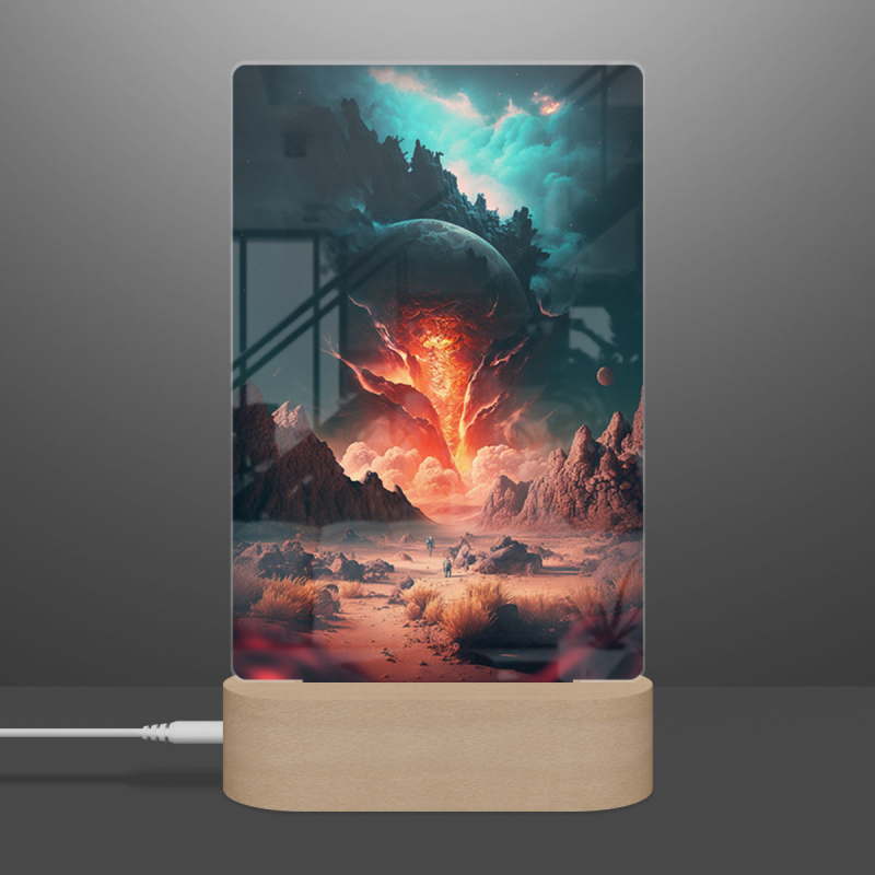Součástí balení je akrylové sklo dle výběru, dřevěný RGB LED stojánek a napájecí USB kabel.