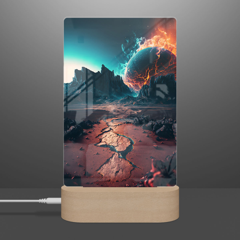 Součástí balení je akrylové sklo dle výběru, dřevěný RGB LED stojánek a napájecí USB kabel.