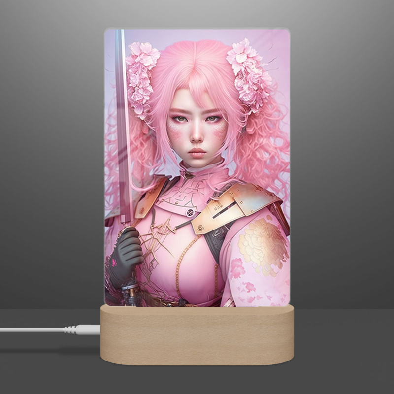 Součástí balení je akrylové sklo dle výběru, dřevěný RGB LED stojánek a napájecí USB kabel.