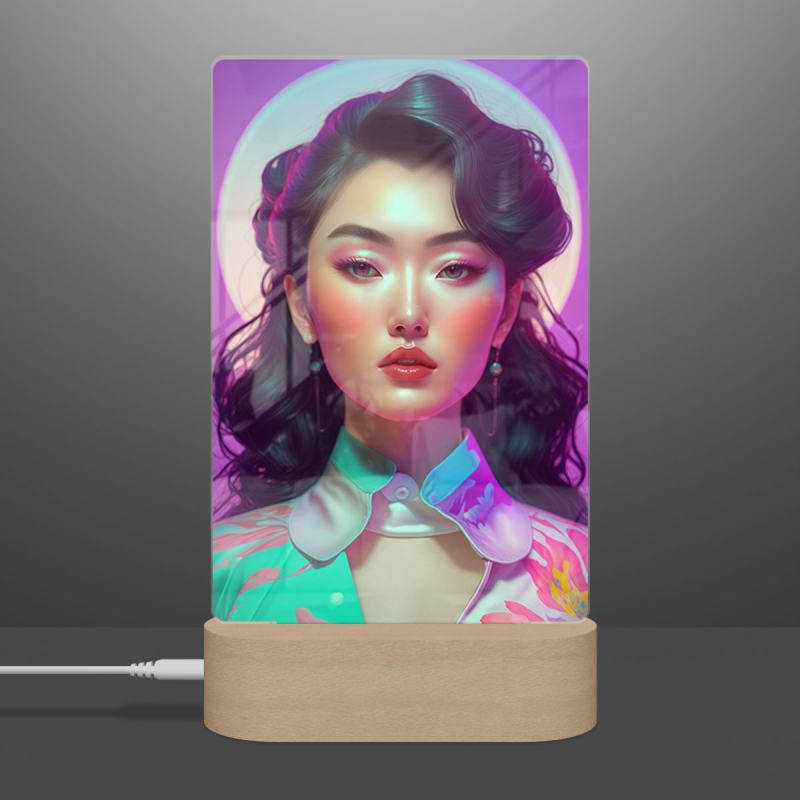 Součástí balení je akrylové sklo dle výběru, dřevěný RGB LED stojánek a napájecí USB kabel.