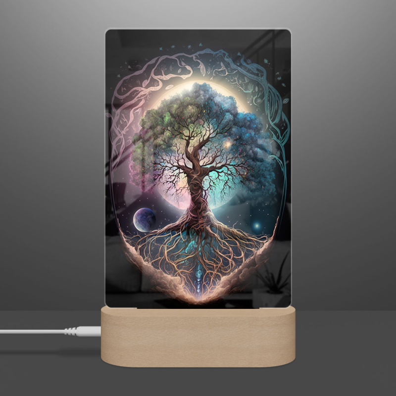 Součástí balení je akrylové sklo dle výběru, dřevěný RGB LED stojánek a napájecí USB kabel.