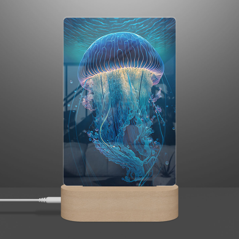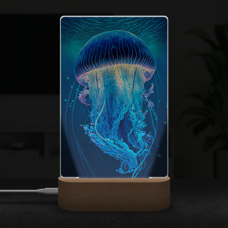 Součástí balení je akrylové sklo dle výběru, dřevěný RGB LED stojánek a napájecí USB kabel.