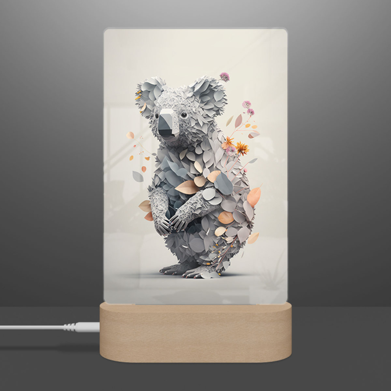 Součástí balení je akrylové sklo dle výběru, dřevěný RGB LED stojánek a napájecí USB kabel.