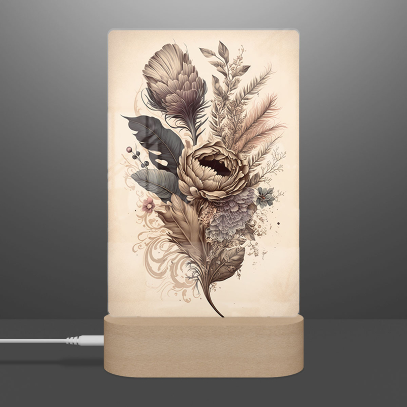 Součástí balení je akrylové sklo dle výběru, dřevěný RGB LED stojánek a napájecí USB kabel.