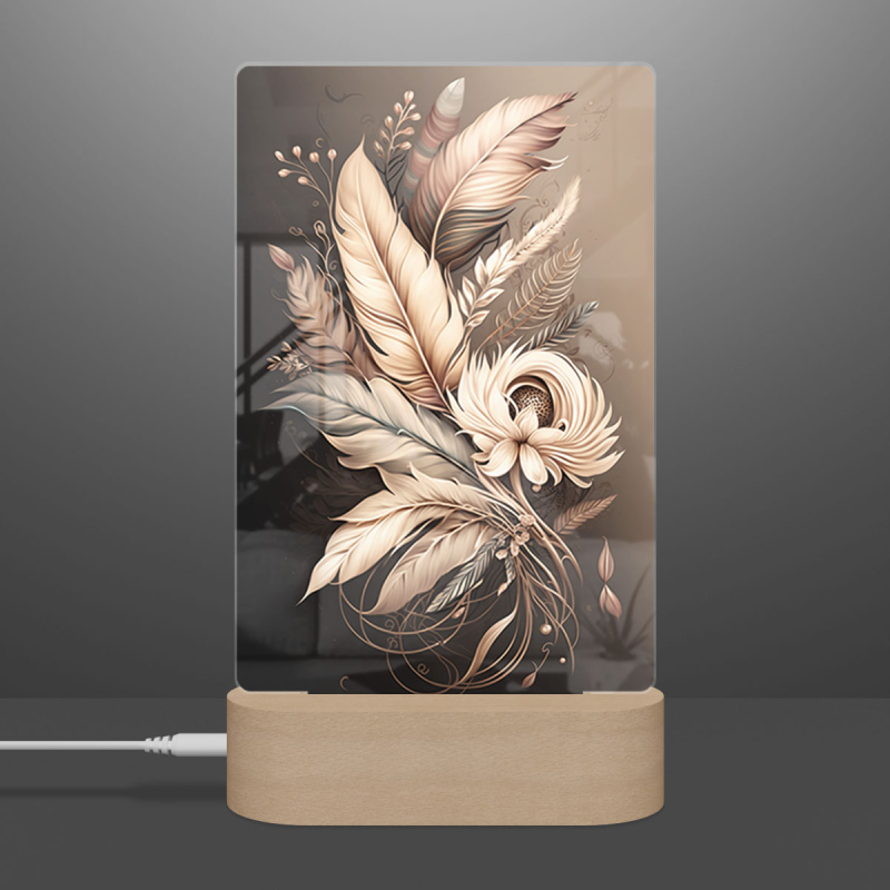 Součástí balení je akrylové sklo dle výběru, dřevěný RGB LED stojánek a napájecí USB kabel.